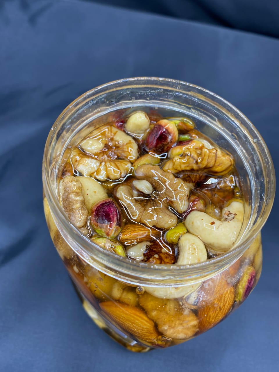 A dry fruits mixture with honey is a nutritious and flavorful blend that combines various dried fruits with natural honey to create a wholesome snack or supplement. This combination harnesses the benefits of both dried fruits and honey, making it a popular choice for boosting energy and overall health.